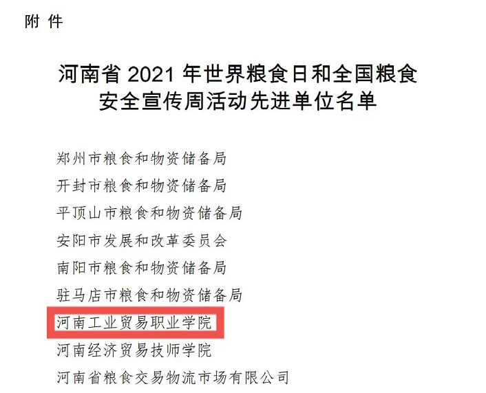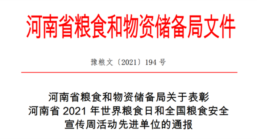 近日,河南省糧食和物資儲備局印發《關于表彰河南省2021年世界糧食日和全國糧食安全宣傳周活動先進單位的通報》(豫糧文〔2021〕194號 ),我校榮獲河南省2021年世界糧食日和全國糧食安全宣傳周活動先進單位。