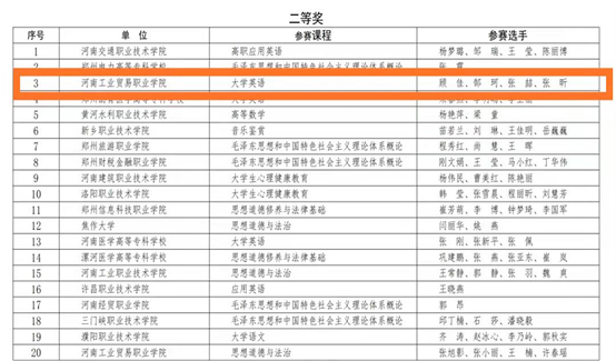 ????2021年12月14日-15日,由河南省教育廳主辦、商丘職業技術學院承辦的的2021年河南省高等職業教育青年教師課堂教學創新大賽在商丘職業技術學院成功舉辦,我院顧佳、郜珂、張喆、張昕四位教師組成的教學團隊榮獲公共基礎課程組二等獎的好成績。