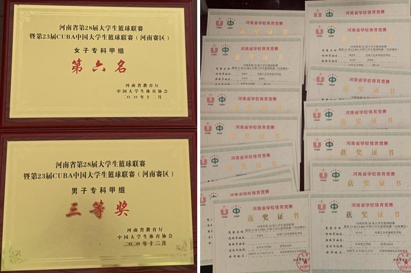 在“河南省第 28 屆大學(xué)生籃球聯(lián)賽暨第 23 屆 CUBA 中國大學(xué)生籃球聯(lián)賽”中,基礎(chǔ)理論教學(xué)部體育教研室吳科科、張曉儉等老師指導(dǎo)訓(xùn)練的籃球代表隊分別獲得“女子組專科甲組第六名”、“男生組獲得了專科甲組三等獎”的好成績;吳科科獲得“優(yōu)秀教練員”榮譽稱號;張關(guān)社、郭申奧、馬賀龍、陳俊紅、陳淑瑩、胡肖艷等同學(xué)獲得“優(yōu)秀運動員”稱號。