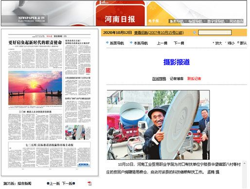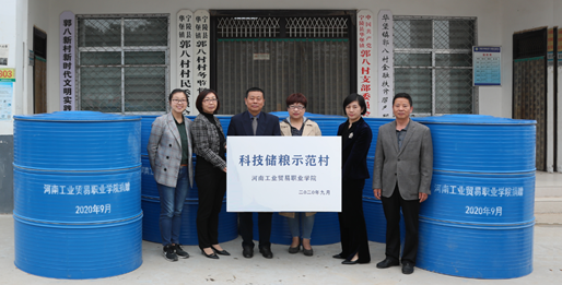 (1)10月12日,學(xué)院為對口幫扶單位--寧陵縣華保鎮(zhèn)郭八村、柿子王村、前屯村264家建檔立卡貧困戶捐贈的簡易糧倉全部制作完成。糧食工程系主任張育輝一行4人來到村里,與寧陵縣科技局有關(guān)領(lǐng)導(dǎo)共同為科技儲糧示范村掛牌,并全面啟動學(xué)院對寧陵縣農(nóng)戶的科技儲糧幫扶工作。264套簡易糧倉分別捐贈給華保鎮(zhèn)郭八村107套、柿子王村92套、前屯村65套。本次活動的新聞圖片被《河南日報》綜合新聞版刊發(fā)。