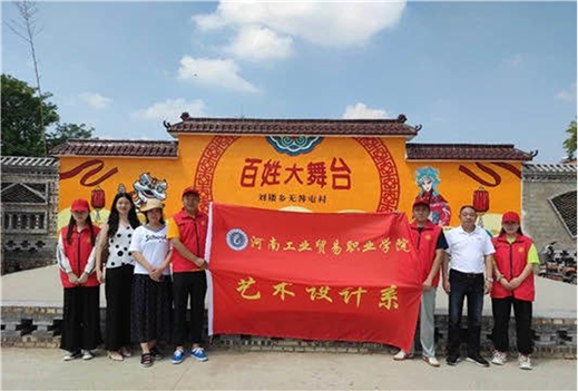 (1)開展“墻繪藝術(shù)進(jìn)寧陵,美麗鄉(xiāng)村添新景”活動。8月11日,藝術(shù)設(shè)計系一行到達(dá)寧陵開展調(diào)研工作,確定了墻繪進(jìn)鄉(xiāng)村的活動。8月25日至29日,藝術(shù)設(shè)計系幫扶小分隊(duì)由周茜和王飛老師帶領(lǐng)19級廣告103班的四位同學(xué),到學(xué)院定點(diǎn)扶貧村——劉樓鄉(xiāng)無咎屯村開展墻繪藝術(shù)活動。設(shè)計并繪制了長12米,高2.6米的舞臺背景墻。背景墻完成后,受到了無咎屯村黨員干部和村民們的一致好評。