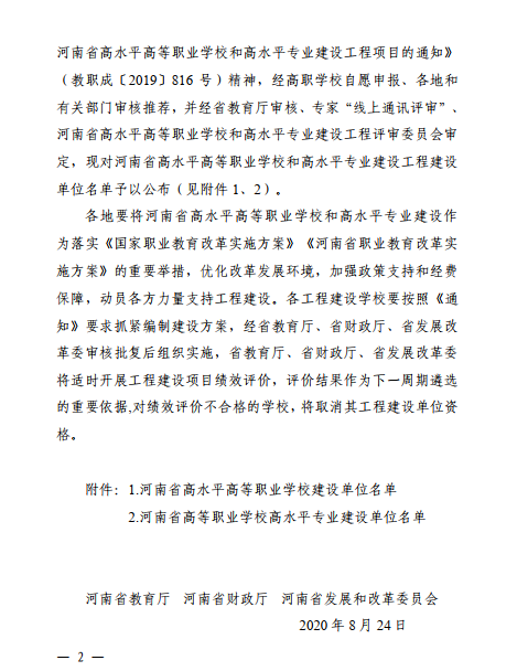 近日,《河南省教育廳 河南省財政廳 河南省發展和改革委員關于公布河南省高水平高等職業學校和高水平專業建設工程建設單位名單的通知》(教職成〔2020〕337號)印發。河南工業貿易職業學院成功入選河南省高水平高等職業學校,電子商務專業成功入選高水平專業群建設工程。這是學院繼今年1月份被認定為省級優質高等職業院校、4月份被評為省級文明校園之后,在辦學70周年迎來的又一個重大喜訊。