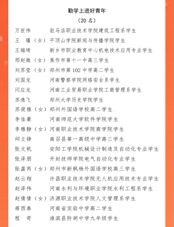 4月29日,獲評名單公布,我院推薦報送的工商管理系18工商103班閆應龍同學榮獲2020年“新時代河南向上向善好青年”稱號,被評為勤學上進好青年。