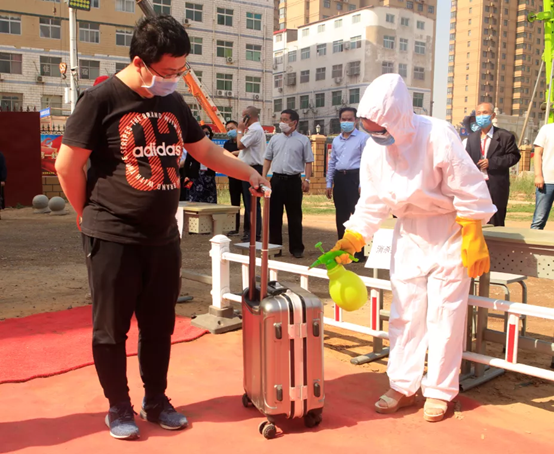 老師扮演的學生或是背著背包或是拉著行李箱,沿著隔離道走到入口處,相隔1.5米排隊有序等候檢測。行李消毒、身份驗證、體溫測量、綠碼出示,每一項流程嚴格通過后,“同學們”終于可以拿著領取的口罩、消毒用品安全有序進入校園。