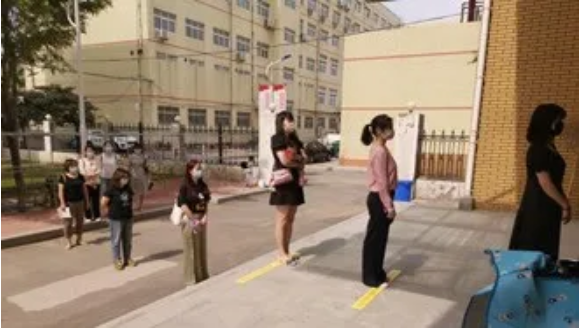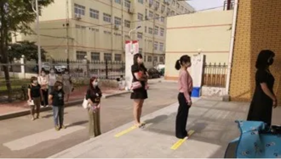 在宿舍門入口處,教師模擬學生保持一定間距,一列縱隊有序進入宿舍。嚴格保持社交距離,并佩戴口罩。