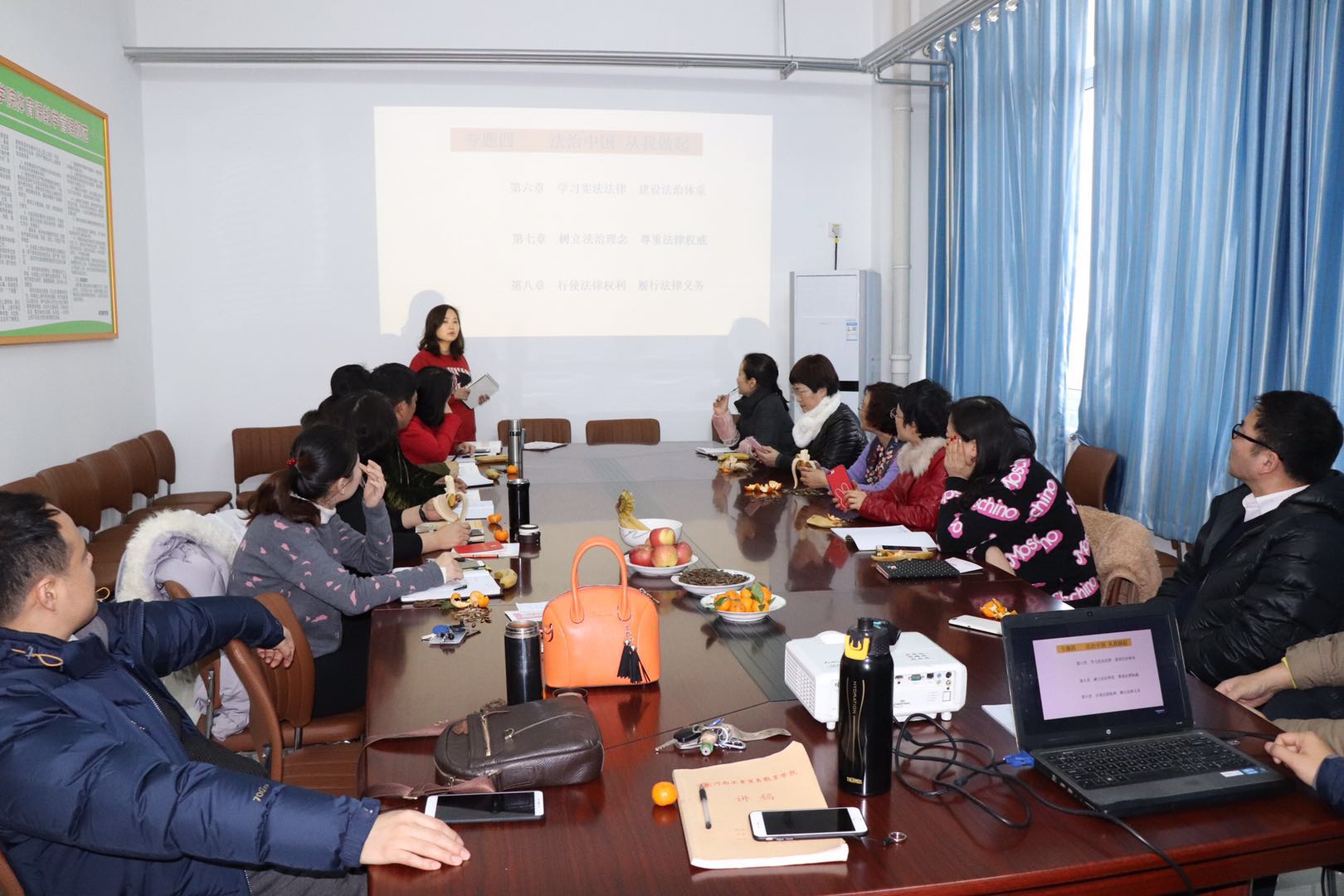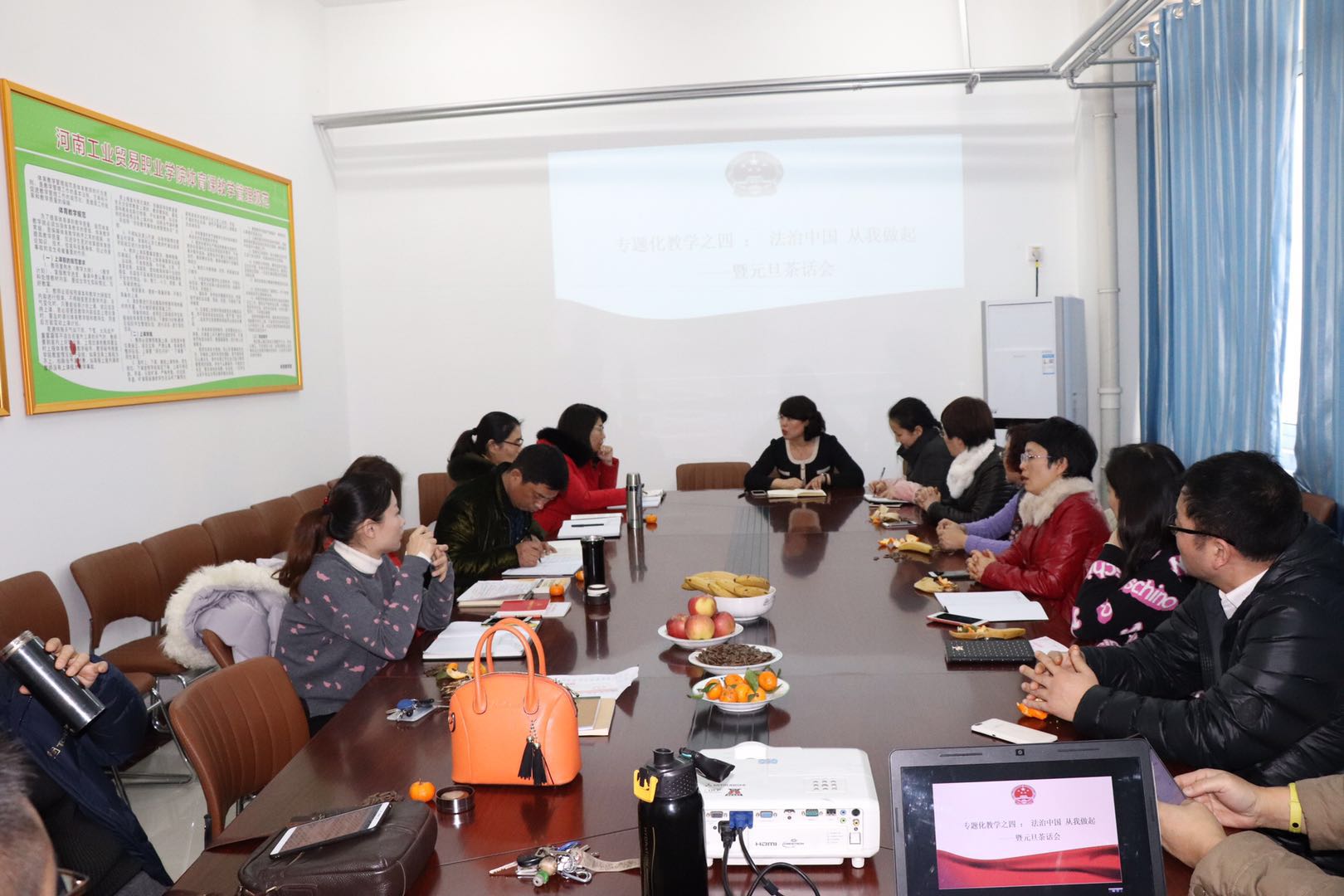 12月26日下午,我院基礎部思想政治理論課教研室就本學期開展的專題化教學進行了總結,并進行了最后一個專題“法治中國 從我做起”的主題教研活動,負責思政課教學的專兼職教師參加了此次活動。