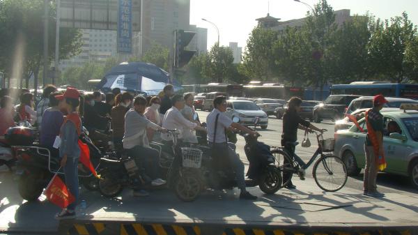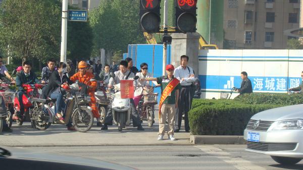 金水路與未來路交叉口是一個車流量大,人流量多的路段,上下班高峰期更是擁擠,交通秩序比較混亂。“同志,這里車流量大,請耐心等待信號燈”, “阿姨請您注意安全,請您慢行”,志愿者們兩人一組,負責一個路口,手持小旗,以一名真正的協管員嚴格要求自己,耐心提醒行人。炎炎烈日志愿者們毫不懈怠絲毫不減認真工作的熱情。當行人遇到問題時,志愿者們積極解答。直到下午七點下班高峰期結束后,志愿者們才結束了一天的工作。