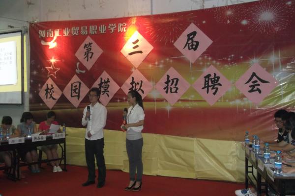 為深入貫徹落實習近平總書記關于中國夢的一系列重要講話精神,幫助大學生轉變就業觀念、增強擇業意識,全面提升求職競爭力,早日實現“就業夢”,5月23日晚七點,河南工業貿易職業學院校園版“職來職往”-——第三屆校園模擬招聘會,在一樓報告廳如期舉行。新穎的形式使這場模擬招聘會人氣大增,院團委學生干部和350余名學生參加了活動。
