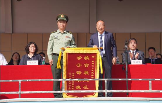 校黨委書記李國鋒代表全校師生,向新鄭市人民武裝部贈送錦旗,充分肯定了訓(xùn)練成果,向辛勤付出的軍訓(xùn)教官們表示感謝。