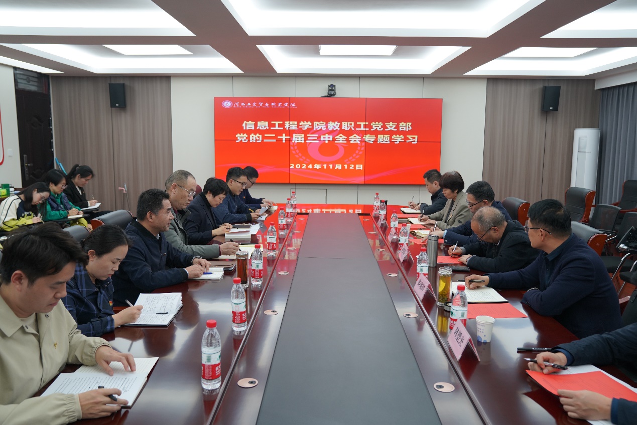 為持續(xù)深入學習貫徹黨的二十屆三中全會精神,全面領會習近平總書記關于全面深化改革的一系列新思想、新觀點、新論斷,切實把思想和行動統(tǒng)一到黨中央決策部署上來,為在不斷深化改革中推動學校高質量發(fā)展,11月12日下午,信息工程學院教職工黨支部全體黨員在優(yōu)勝校區(qū)開展以“學習貫徹黨的二十屆三中全會精神 堅定走好現代職業(yè)教育改革之路”為主題的集體理論學習,校黨委書記李國鋒、黨委副書記柴瑞帥等一行前來開展巡聽旁聽。