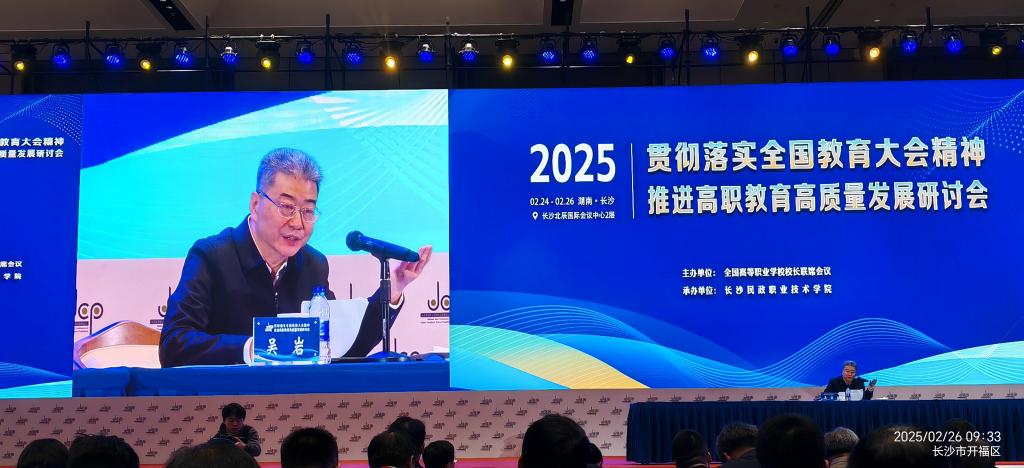 2月25日至26日,由全國高等職業(yè)學(xué)校校長聯(lián)席會議主辦、長沙民政職業(yè)技術(shù)學(xué)院承辦的“貫徹落實全國教育大會精神,推進高職教育高質(zhì)量發(fā)展”專題研討會在長沙舉行,教育部黨組成員、副部長吳巖出席會議并作主旨講話,教育部職業(yè)教育與成人教育司司長彭斌柏,湖南省人大常委會黨組副書記、副主任楊浩東等領(lǐng)導(dǎo)和嘉賓出席會議。我校黨委副書記、校長曹利強受邀參會。