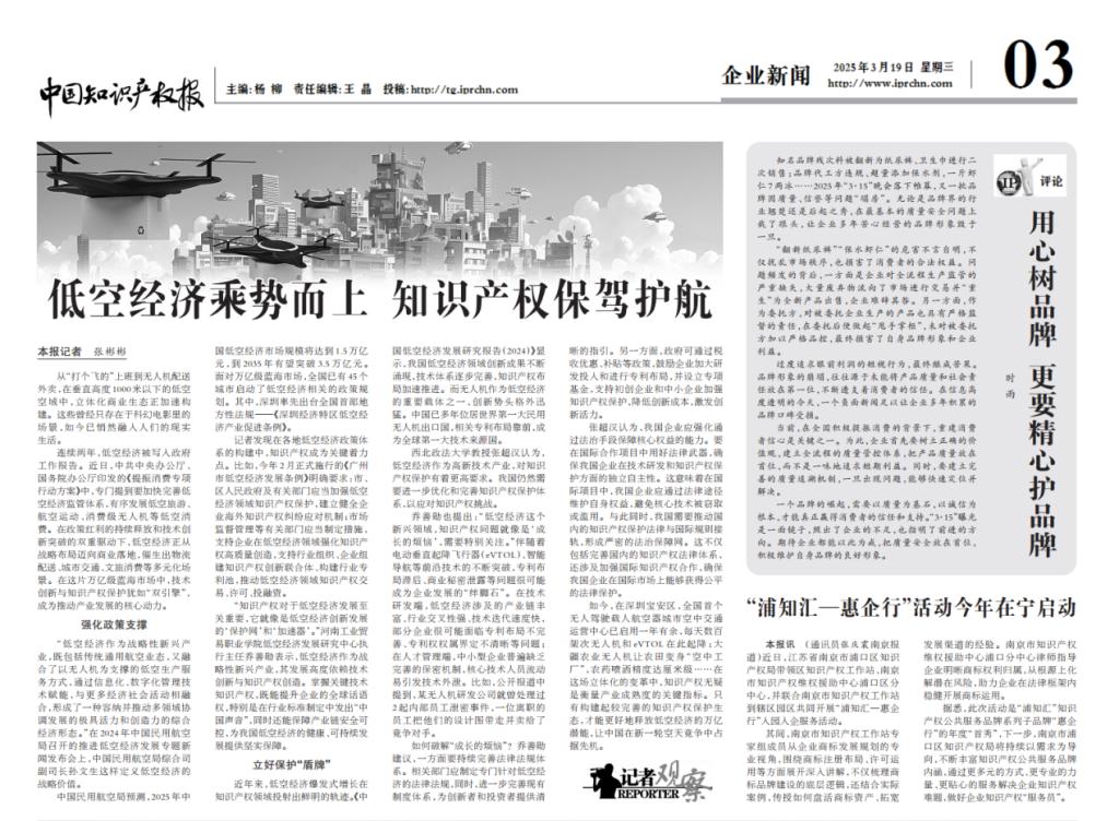 3月19日,中國知識產權報刊發《低空經濟乘勢而上 知識產權保駕護航》一文中對我校低空經濟發展研究中心執行主任喬善勛進行采訪。