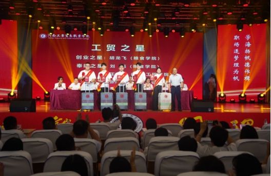 畢業(yè)典禮在莊嚴(yán)的國(guó)歌聲中拉開帷幕。校黨委書記李國(guó)鋒為“工貿(mào)之星”頒發(fā)榮譽(yù)證書和獎(jiǎng)品。