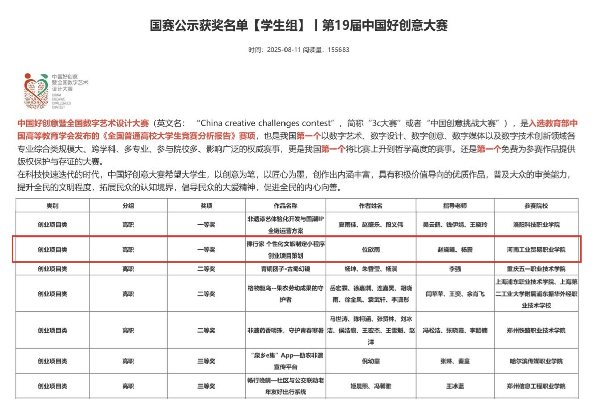 近日,第19屆中國好創(chuàng)意暨全國數(shù)字藝術(shù)設(shè)計(jì)大賽(China Creative Challenges Contest,簡稱“3C大賽”或“中國創(chuàng)意挑戰(zhàn)大賽”)【學(xué)生組】全國總決賽圓滿落幕。我校師生首次參賽,憑借創(chuàng)業(yè)項(xiàng)目類作品《豫行家--個(gè)性化文化旅游制定小程序創(chuàng)業(yè)項(xiàng)目策劃》斬獲國賽一等獎(jiǎng)。