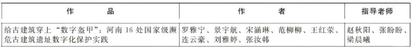 自賽事啟動以來,我校黨委高度重視,團委牽頭統籌,各二級學院積極響應,組建專家團隊,從作品選題、方案設計、研究論證到答辯展示,為參賽學生提供全流程精準指導。其中,由趙秋陽、張盼盼、梁晨曦三位老師指導的參賽作品《給古建筑穿上“數字盔甲”:河南16處國家級瀕危古建筑遺址數字化保護實踐》斬獲特等獎。