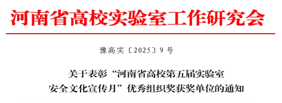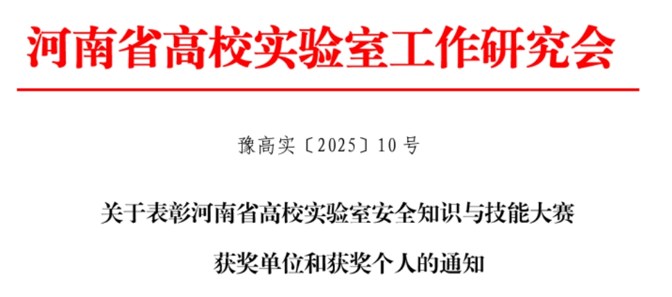 近日,我校在2025年河南省高校實(shí)驗(yàn)室安全文化建設(shè)與知識(shí)技能競(jìng)賽中,榮獲“河南省第五屆實(shí)驗(yàn)室安全文化宣傳月優(yōu)秀組織獎(jiǎng)”“2025年河南省高校實(shí)驗(yàn)室安全知識(shí)與技能大賽優(yōu)秀組織獎(jiǎng)”2項(xiàng)集體獎(jiǎng)項(xiàng)及6項(xiàng)省賽個(gè)人獎(jiǎng)項(xiàng)。