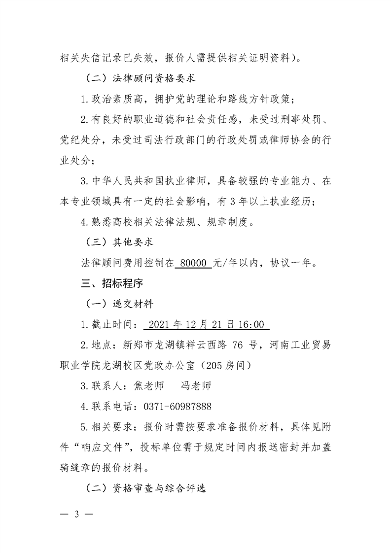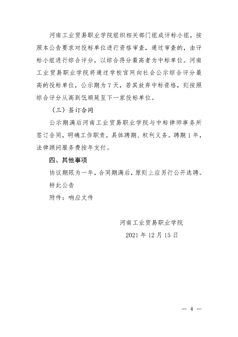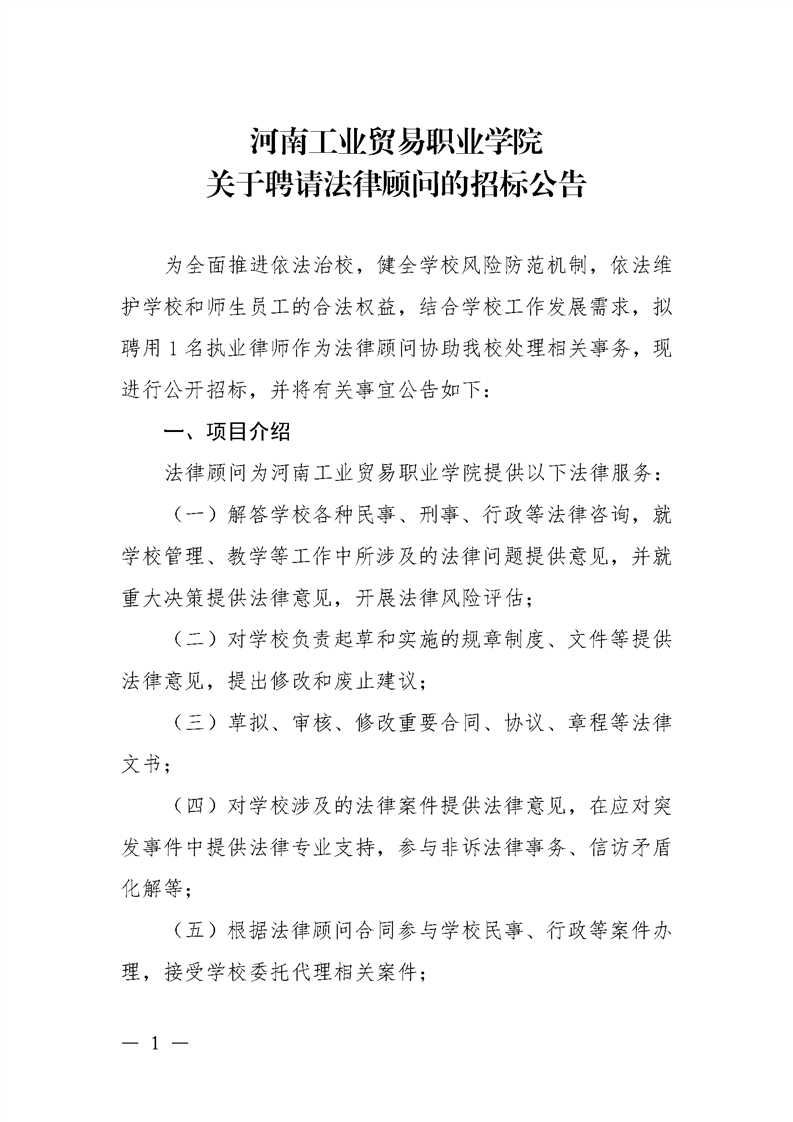 河南工業貿易職業學院關于聘請法律顧問的招標公告