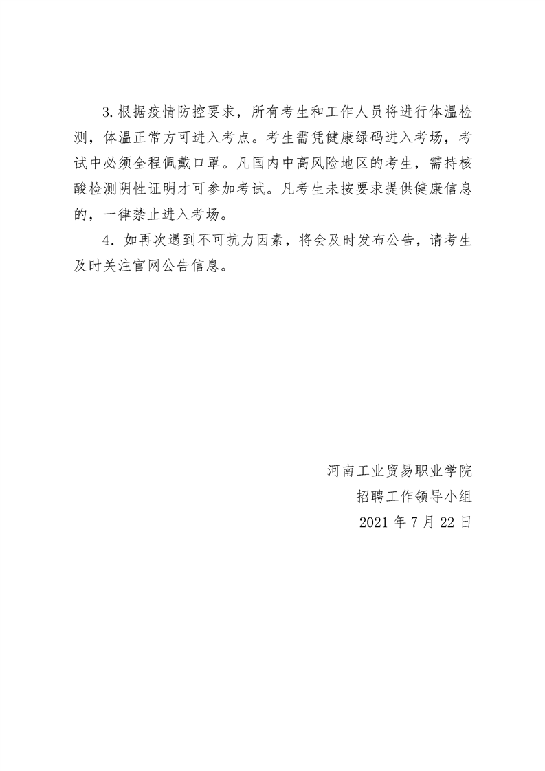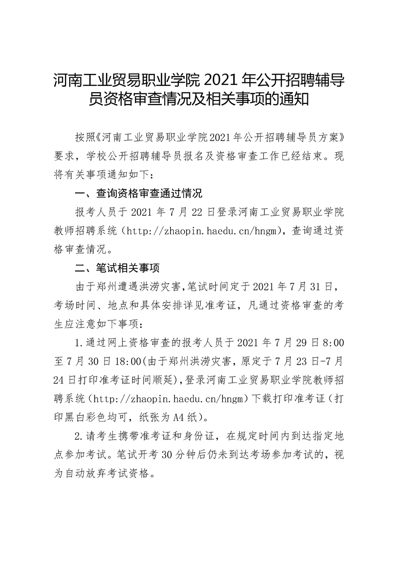 河南工業貿易職業學院2021年公開招聘輔導員資格審查情況及相關事項的通知