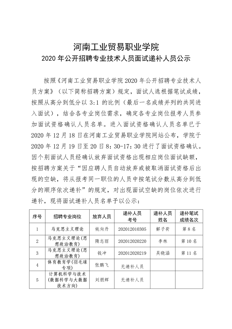 河南工業(yè)貿(mào)易職業(yè)學(xué)院2020年公開(kāi)招聘專業(yè)技術(shù)人員面試遞補(bǔ)人員公示