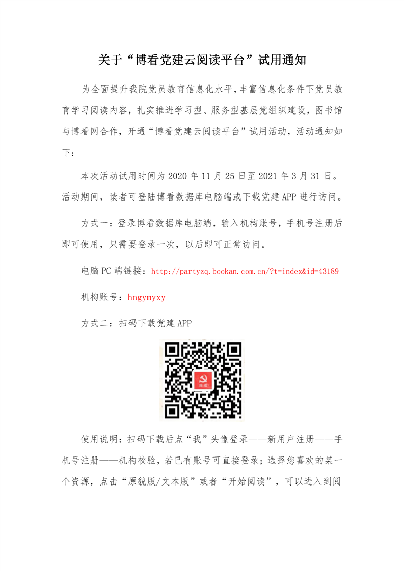 河南工業(yè)貿(mào)易學院圖書館開通博看黨建云閱讀試用通知