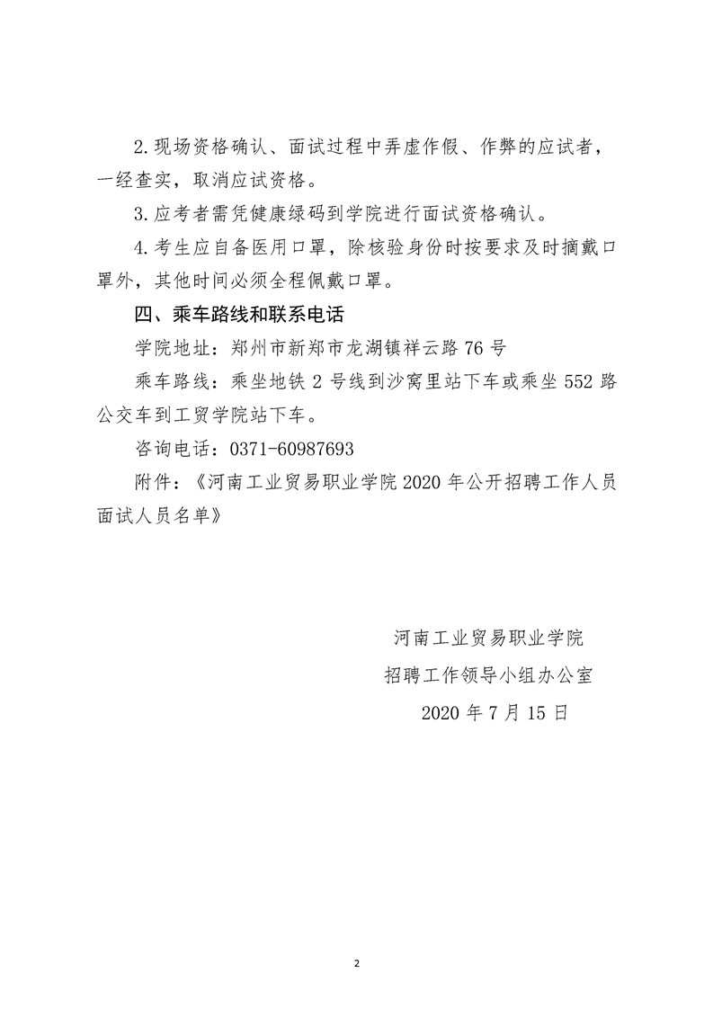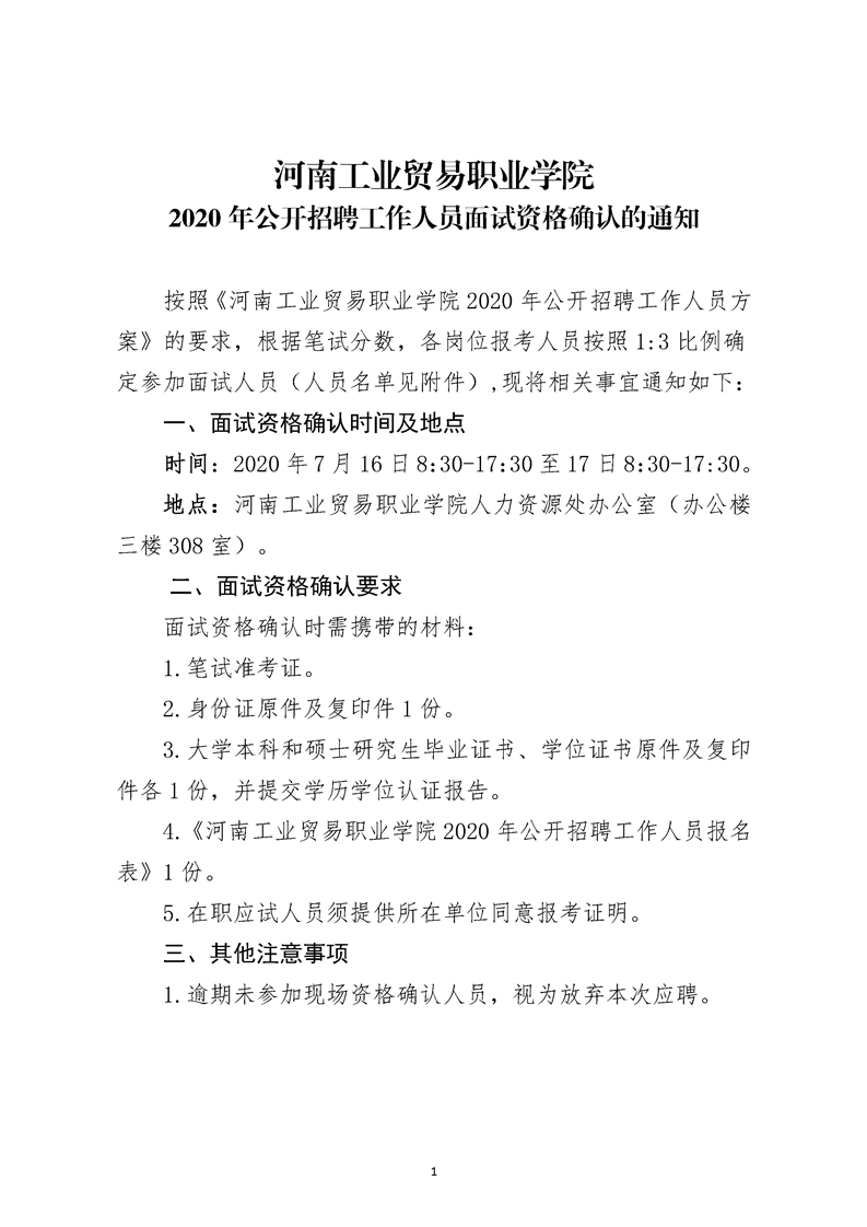 河南工業貿易職業學院2020年公開招聘工作人員面試資格確認通知