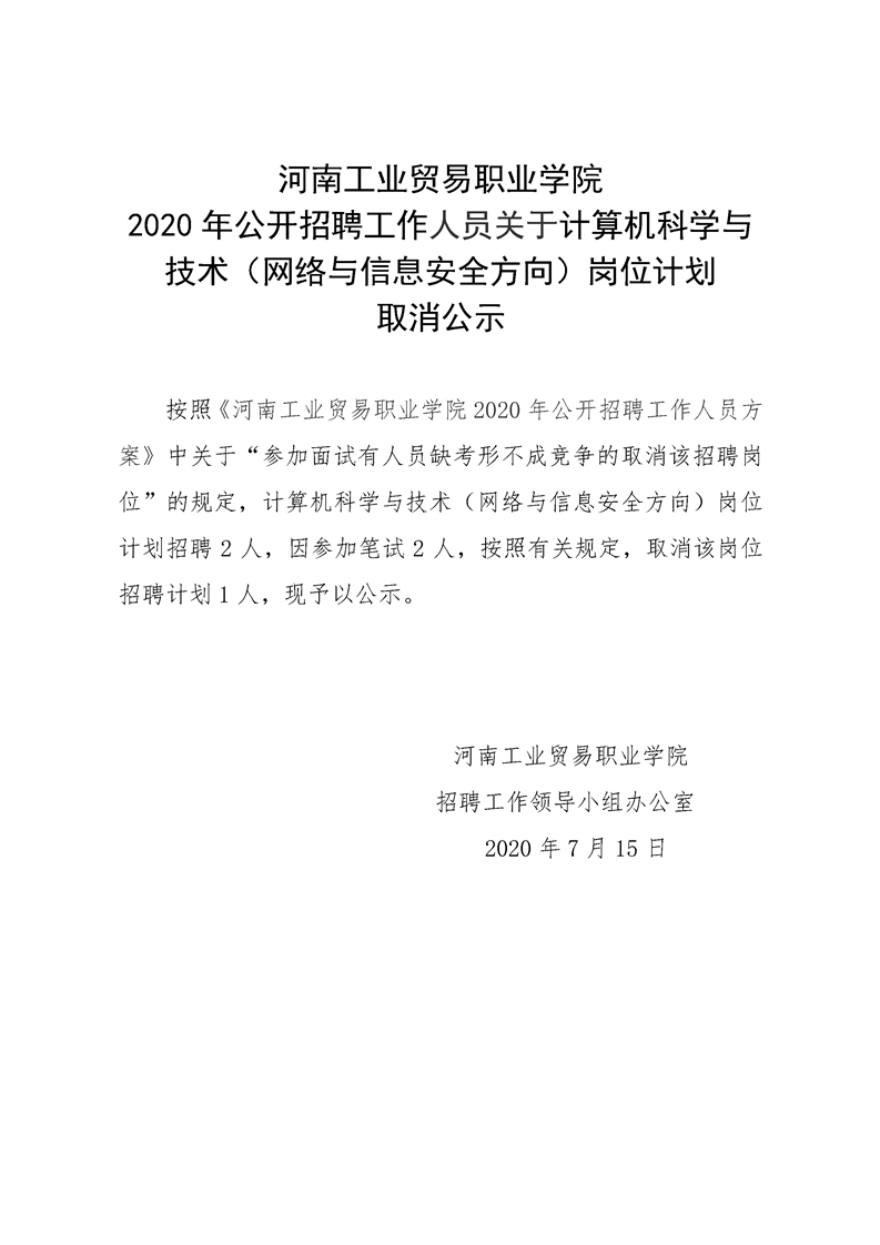河南工業貿易職業學院2020年公開招聘工作人員關于取消計算機科學與技術(網絡與信息安全方向)崗位計劃公示