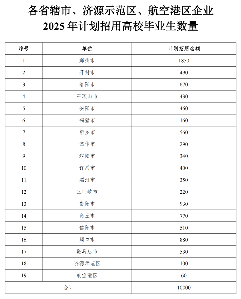 各省轄市、濟(jì)源示范區(qū)、航空港區(qū)企業(yè)2025年計(jì)劃招用高校畢業(yè)生數(shù)量見附件1。