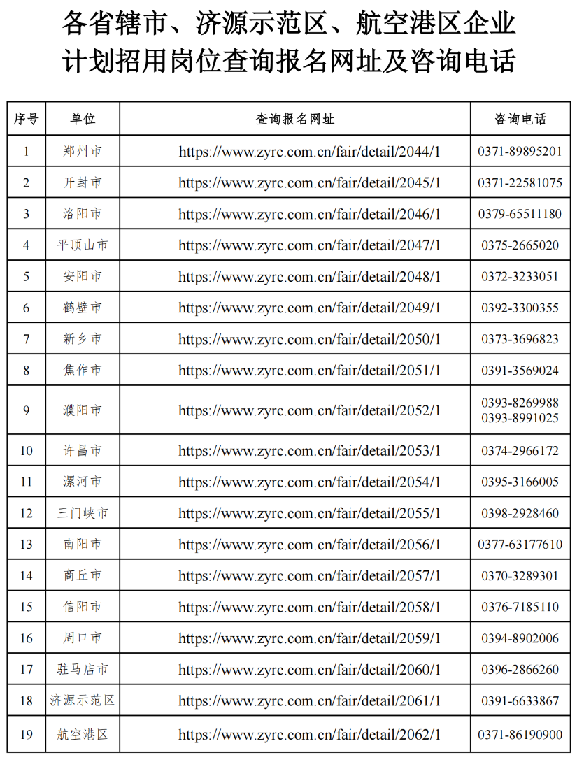 本次招用采取線上報(bào)名方式,自本公告發(fā)布之日起報(bào)名,招滿即止。各省轄市、濟(jì)源示范區(qū)、航空港區(qū)企業(yè)招用崗位查詢報(bào)名網(wǎng)址及咨詢電話見附件2。報(bào)名人員應(yīng)仔細(xì)閱讀公告及相關(guān)附件,全面了解崗位要求,自行判斷是否具備相應(yīng)條件,避免錯(cuò)報(bào)。