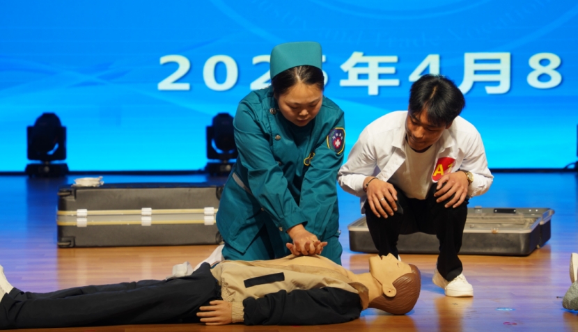 大賽創新融入“生命教育”實踐環節。河南省第二人民醫院急科主任李瑞娜、護士長李亞莉及團隊成員現場進行心肺復蘇培訓并指導參賽選手實操。柴瑞帥帶領寢室長們在醫生的指導下學習黃金救援技能。現場還播放了《火場逃生指南》。