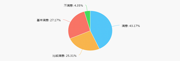 43.17%的畢業(yè)生對學院的就業(yè)工作表示滿意,25.31%的畢業(yè)生比較滿意, 27.17%的畢業(yè)生認為基本滿意,4.35%的畢業(yè)生表示不滿意。