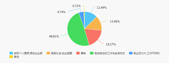 近半數(shù)畢業(yè)生表示愿意創(chuàng)業(yè)的原因是喜歡自由自主的工作與生活方式,其次是為了賺錢、服務社會創(chuàng)業(yè)報國。