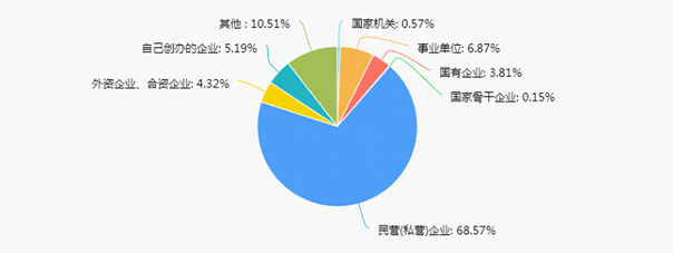 68.57%畢業(yè)生在民營(私營)企業(yè)工作,較16年上升12個百分點;在國家機關事業(yè)單位及國有企業(yè)工作的占11.25%,較16年上升4個百分點;外資合資企業(yè)工作的占4.32%;在自有企業(yè)工作的占5.19%;其他占10.51%。