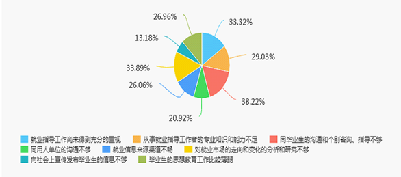 畢業(yè)生認為學院就業(yè)指導中存在的主要問題是同畢業(yè)生的溝通和個別咨詢、指導不夠。其次是對就業(yè)市場的走向和變化的分析和研究不夠、就業(yè)信息來源渠道不暢。