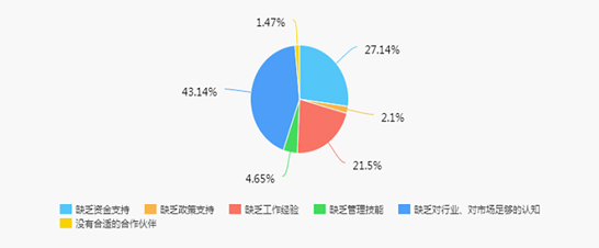 43.14%的畢業(yè)生認為創(chuàng)業(yè)中最大的困境是創(chuàng)業(yè)動機盲目,缺乏對行業(yè)、對市場足夠的認知,其次是缺乏資金支持及工作經(jīng)驗。