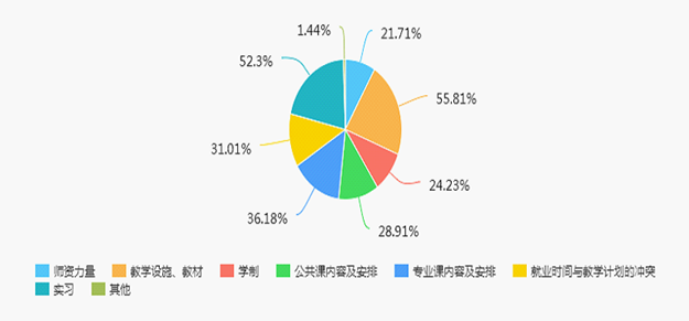 畢業(yè)生認為學院最值得研討和改進的工作是教學設施、教材,其次是實習、專業(yè)課內(nèi)容及安排。