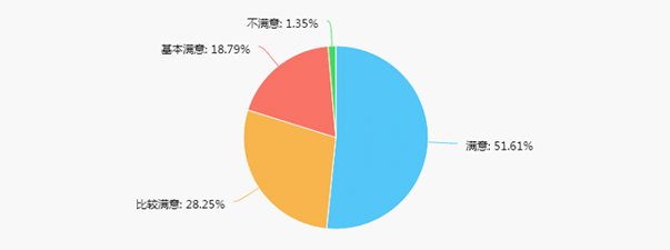 2017年畢業(yè)生對學院各項工作表示滿意的占51.65%,比去年上升5個百分點;比較滿意的占28.25%,,基本滿意的占18.79%,不滿意的占1.35%。