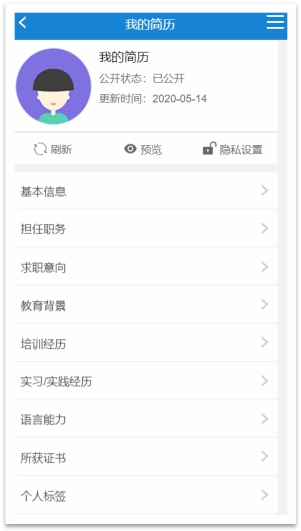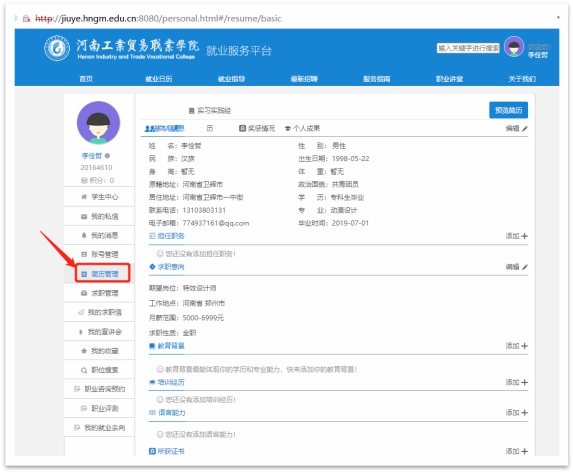簡歷管理,學生根據實際情況填寫個人簡歷信息。完成后方可進行投遞。
