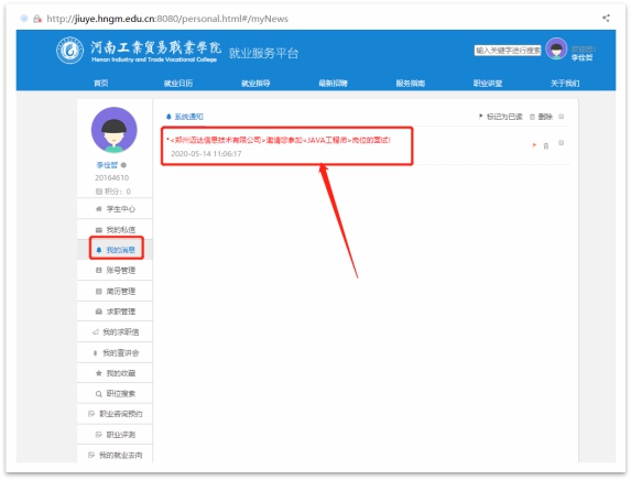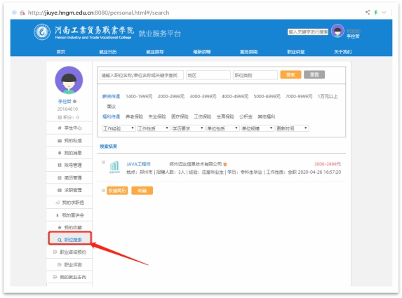 2、電腦端使用方法:輸入http://jiuye.hngm.edu.cn:8080,打開就業服務平臺→學生登錄→查看/搜索意向企業或崗位→選擇崗位→投放電子簡歷→等待企業發起面試邀請,通過電話、郵件等形式通知。