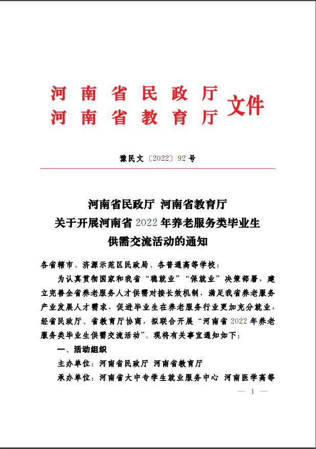河南省民政廳 河南省教育廳 關(guān)于開(kāi)展河南省2022年養(yǎng)老服務(wù)類畢業(yè)生供需交流活動(dòng)的通知