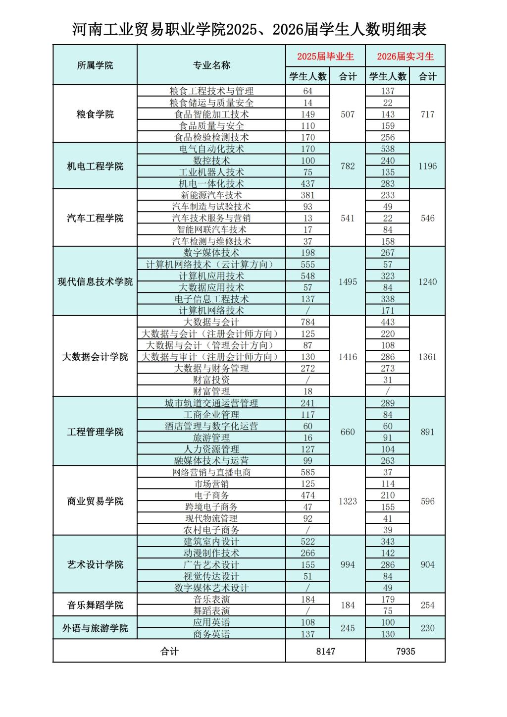 河南工業(yè)貿(mào)易職業(yè)學(xué)院 (hngm.edu.cn)是河南省首批高職“雙高工程”建設(shè)單位,保持河南省高職院校第一方陣。學(xué)校創(chuàng)建于1950年,2022年劃歸河南省教育廳管理。學(xué)校因“糧”而立、依“糧”而為,從為“糧”而育到全面發(fā)展,形成了以糧食類專業(yè)為龍頭、工貿(mào)協(xié)調(diào)發(fā)展的專業(yè)群體,涉及食品藥品與糧食、裝備制造、電子與信息、財(cái)經(jīng)商貿(mào)、文化藝術(shù)、土木建筑旅游、新聞傳播、公共管理與服務(wù)、交通運(yùn)輸、教育與體育等 11 大類。現(xiàn)有 13 個(gè)教學(xué)單位,50個(gè)專業(yè)(方向),在校生2.3萬余人。