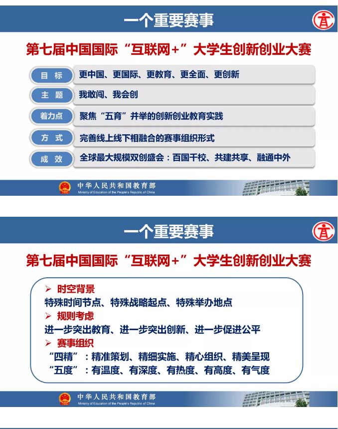 以下為吳巖司長《夯實(shí)教學(xué)“新基建” 托起培養(yǎng)高質(zhì)量》主題報(bào)告PPT中關(guān)于第七屆中國國際“互聯(lián)網(wǎng)+”大學(xué)生創(chuàng)新創(chuàng)業(yè)大賽的內(nèi)容: