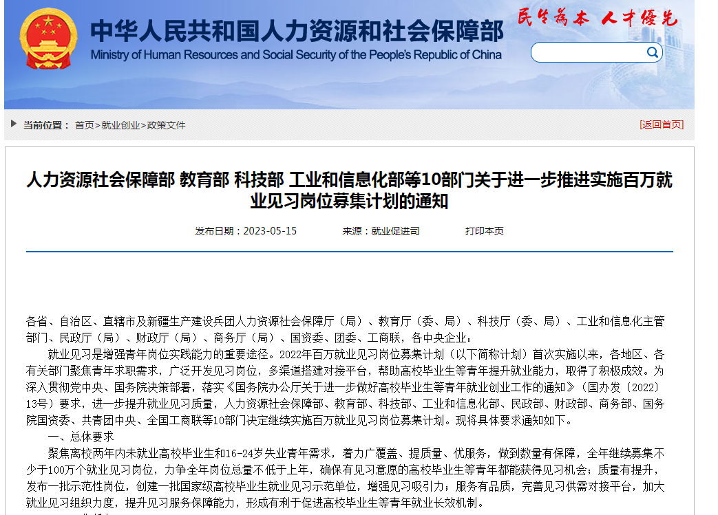 就業見習是增強青年崗位實踐能力的重要途徑。2022年百萬就業見習崗位募集計劃(以下簡稱計劃)首次實施以來,各地區、各有關部門聚焦青年求職需求,廣泛開發見習崗位,多渠道搭建對接平臺,幫助高校畢業生等青年提升就業能力,取得了積極成效。為深入貫徹黨中央、國務院決策部署,落實《國務院辦公廳關于進一步做好高校畢業生等青年就業創業工作的通知》(國辦發〔2022〕13號)要求,進一步提升就業見習質量,人力資源社會保障部、教育部、科技部、工業和信息化部、民政部、財政部、商務部、國務院國資委、共青團中央、全國工商聯等10部門決定繼續實施百萬就業見習崗位募集計劃。現將具體要求通知如下。