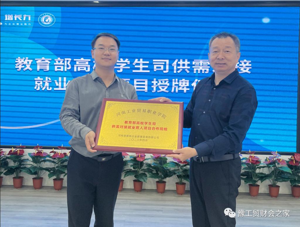 河南工業貿易職業學院與河南慧算賬企業管理咨詢有限公司聯合申報的教育部高校學生司第二期供需對接就業育人項目——“慧算賬數字化財務產業學院項目(定向人才培養培訓項目)”,經過申報、專家評審等程序于2023年4月通過教育部高校學生司立項?;鬯阗~集團副總祁懷順代表慧算賬公司為河南工業貿易職業學院頒發“教育部高校學生司供需對接就業育人項目合作院?!迸曝?。