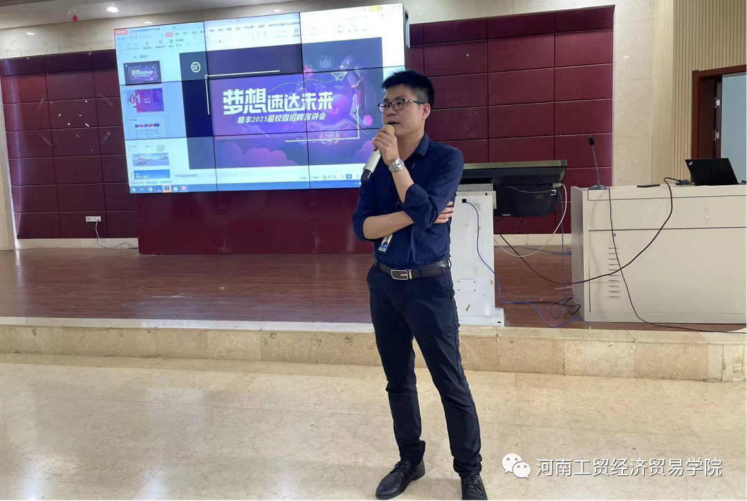 大型宣講會結束后,不同專業的同學和用人企業分別在各個教室進一步的了解,溝通,及簡單的面試。順豐速運蘇滬校園招聘負責人胡云生,以“夢想速達未來”為主題,在3307教室為21級物流管理專業的學生詳細介紹順豐的歷程、順豐科技,以及順豐的未來發展前景;細致講解了中轉儲備實習生、客服中心崗兩個招聘崗位的主要工作內容、招聘要求,薪資及福利待遇。同學們興致頗高,還對辦公環境,場地工作環境,住宿條件等問題紛紛向胡經理提問,現場氣氛十分熱烈。