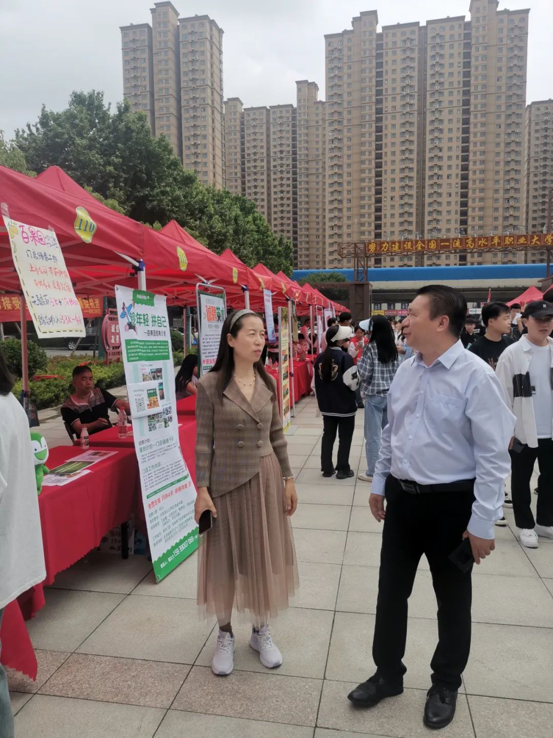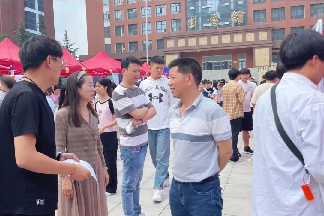 見面會后,企業代表移步至紅旗廣場參加雙選會。本次雙選會由河南工業貿易職業學院就業處主辦,為我院畢業生提供了眾多專業對口的崗位。校黨委書記劉合行親臨現場了解雙選會情況,并與用人單位進行了親切交流,認真聽取了用人單位對我校人才培養、學科專業、校企合作等方面的意見和建議,同時鼓勵我院發揮外語專業優勢,開源拓崗,推動校企合作走深走實。
