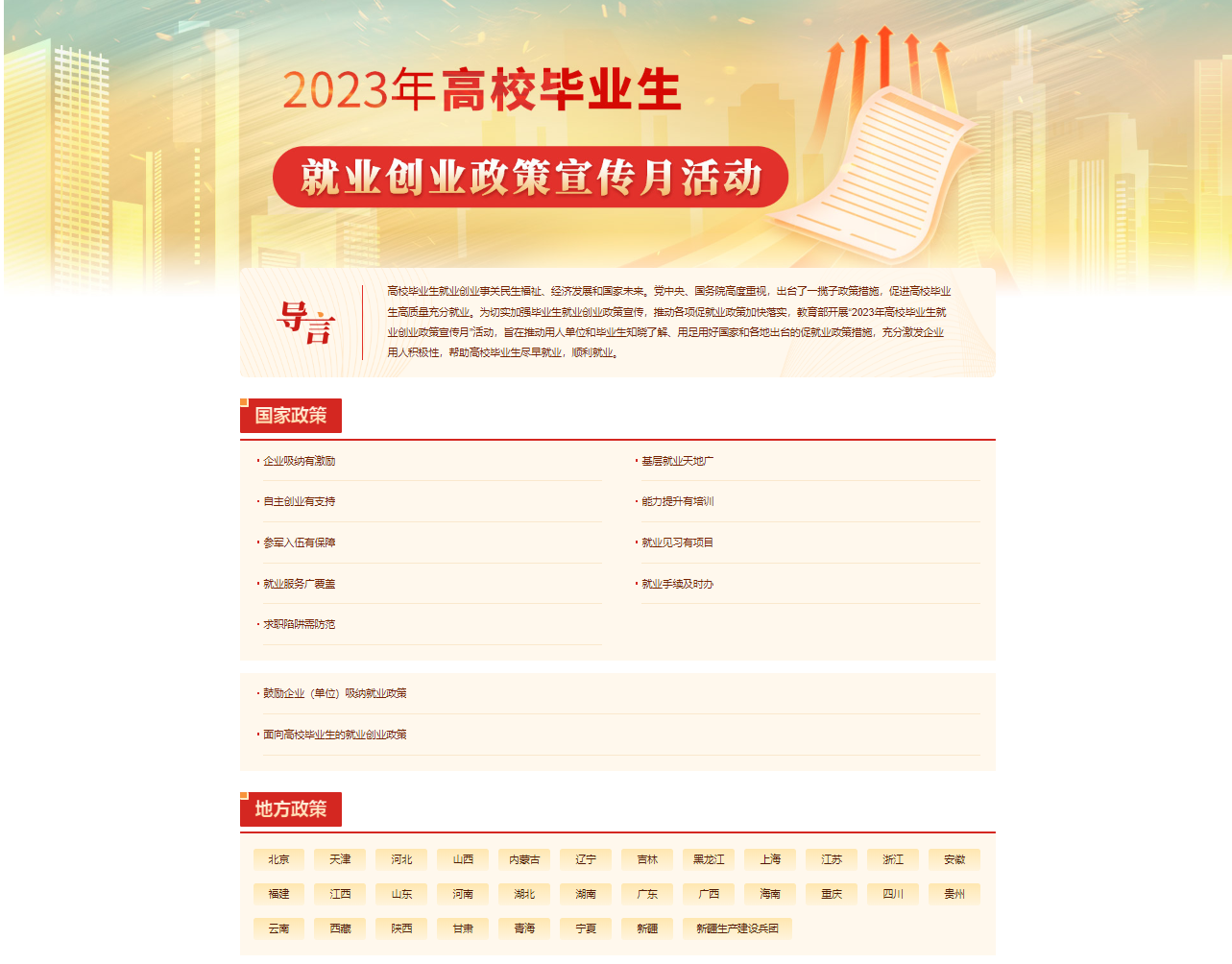 高校畢業生就業創業事關民生福祉、經濟發展和國家未來。黨中央、國務院高度重視,出臺了一攬子政策措施,促進高校畢業生高質量充分就業。為切實加強畢業生就業創業政策宣傳,推動各項促就業政策加快落實,教育部開展“2023年高校畢業生就業創業政策宣傳月”活動,旨在推動用人單位和畢業生知曉了解、用足用好國家和各地出臺的促就業政策措施,充分激發企業用人積極性,幫助高校畢業生盡早就業,順利就業。https://www.ncss.cn/zchz/
