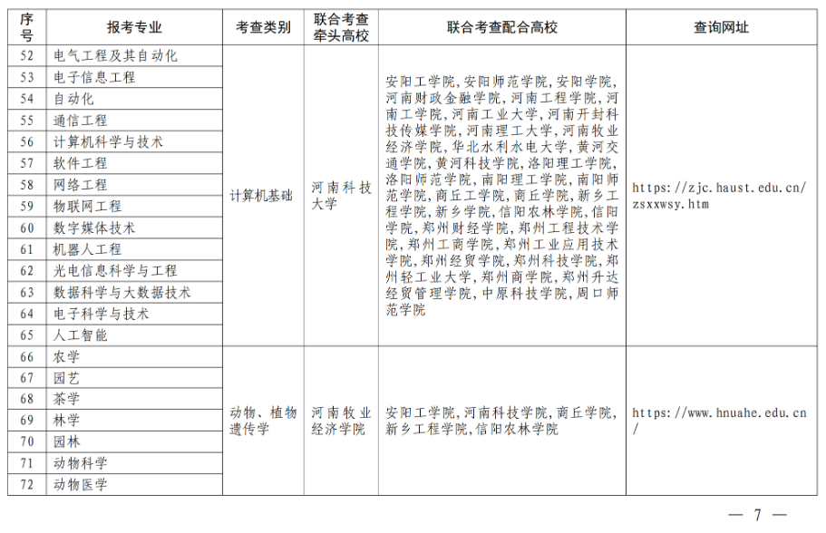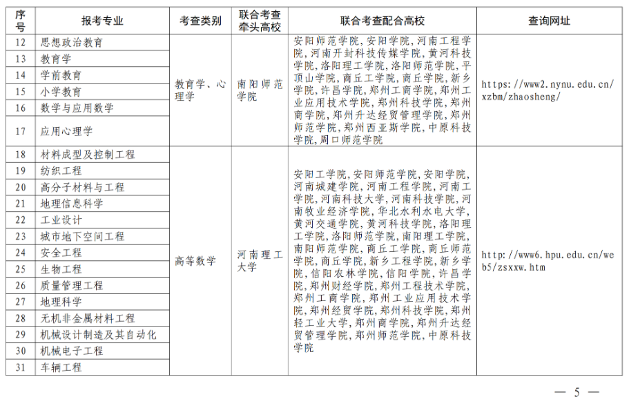 二、合理制定聯考方案。各聯合考查組要根據本專業大類培養目標和對考生能力的要求,結合報考情況,合理制定聯合考查方案,明確高校考查時間、考查地點、考查方式、錄取規則、聯系電話、網址等事項。各牽頭高校要于3月6日前將聯合考查方案上傳至“河南省普通高校招生章程核定系統”(網址:http://zszcba.haedu.gov.cn)進行核定,3月20日前向社會公布。考生可登錄附表中的相關網址進行查詢。