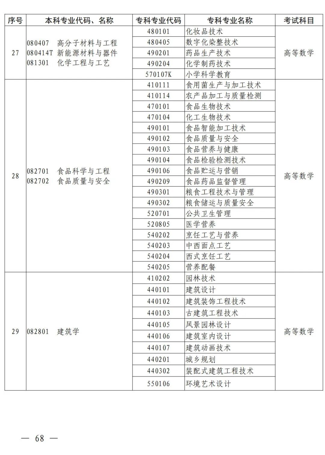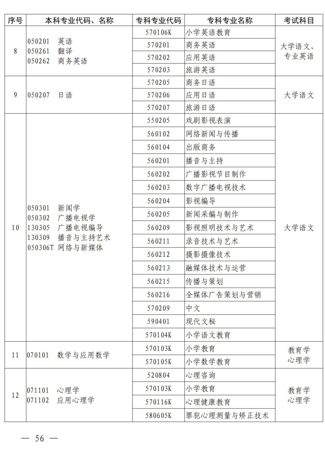 2.考試內(nèi)容。考生須參加全省統(tǒng)一組織的專升本考試。考試科目為英語(英語專業(yè)考生為《專業(yè)英語》,非英語專業(yè)考生為《公共英語》)、專業(yè)綜合(體、音、舞、美專業(yè)為專業(yè)加試)兩科,每科滿分為150分。專業(yè)綜合考試以本科招生專業(yè)的專業(yè)課或?qū)I(yè)基礎課分類,按照《本、專科專業(yè)對照及考試課程一覽表》規(guī)定的考試課程進行命題。