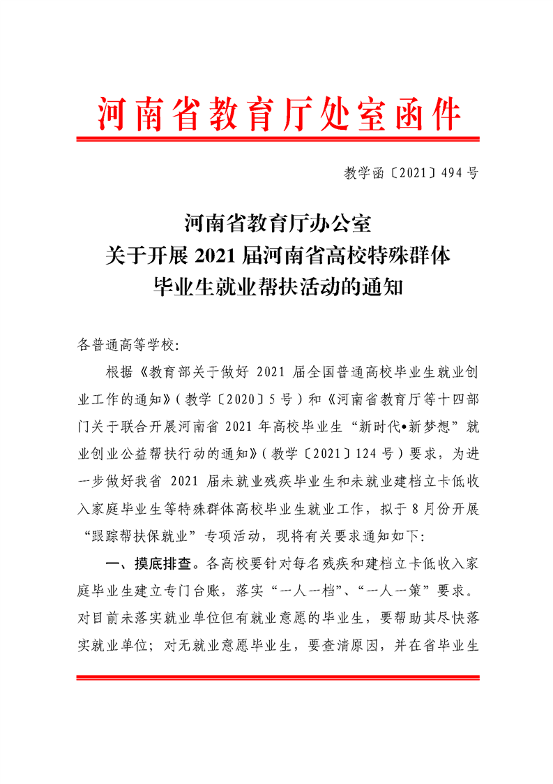 河南省教育廳辦公室 關于開展 2021 屆河南省高校特殊群體 畢業生就業幫扶活動的通知