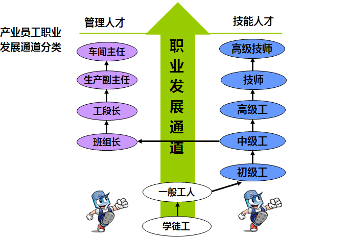 工廠為員工提供通暢的學歷提升、技能等級晉升鑒定、多崗位技能培訓平臺,員工通過個人努力,可以逐步晉升至班長、段長、車間管理、車間主任,車間技術員、車間技術質量主任、工廠其他技術崗位。